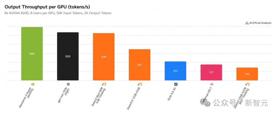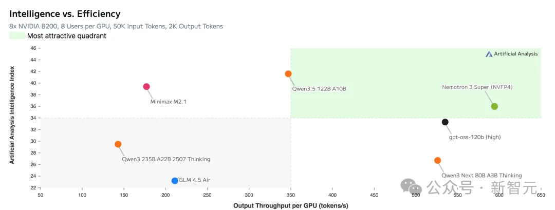而且,在输入序列长度为8k、输出序列长度为64k时,它的吞吐量分别比GPT-OSS-120B和Qwen3.5-122B高出多达2.2倍和7.5倍。