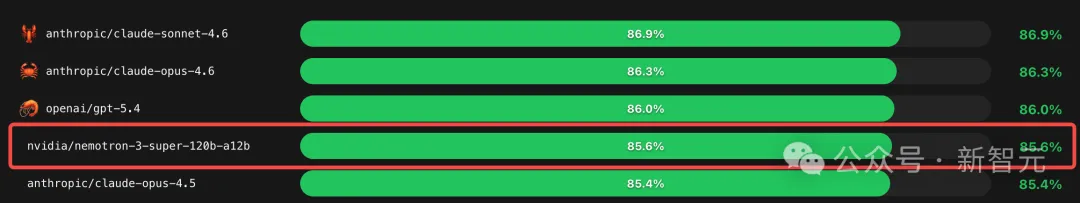 在Pinchbench基准上,Nemotron 3 Super一骑绝尘,稳坐开源第一。