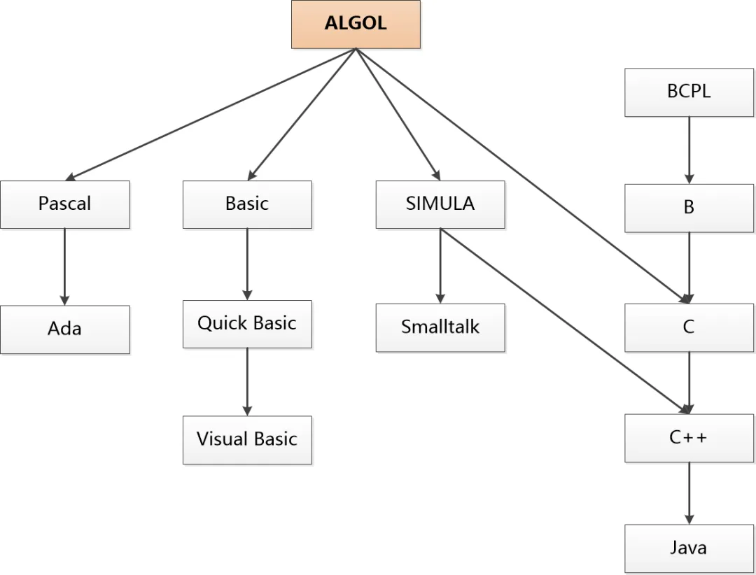 从下图中,就可以看到ALGOL的江湖地位,是很多编程语言的老祖宗。