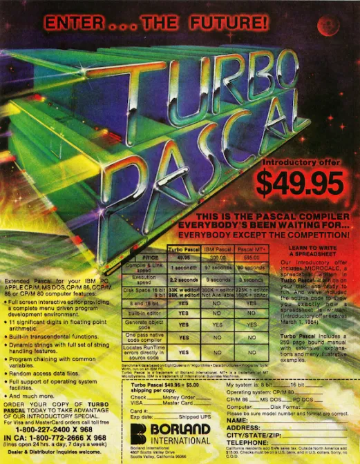 1983年,Borland推出了革命性的集成开发环境,Turbo Pascal ,仅卖49.95美元。