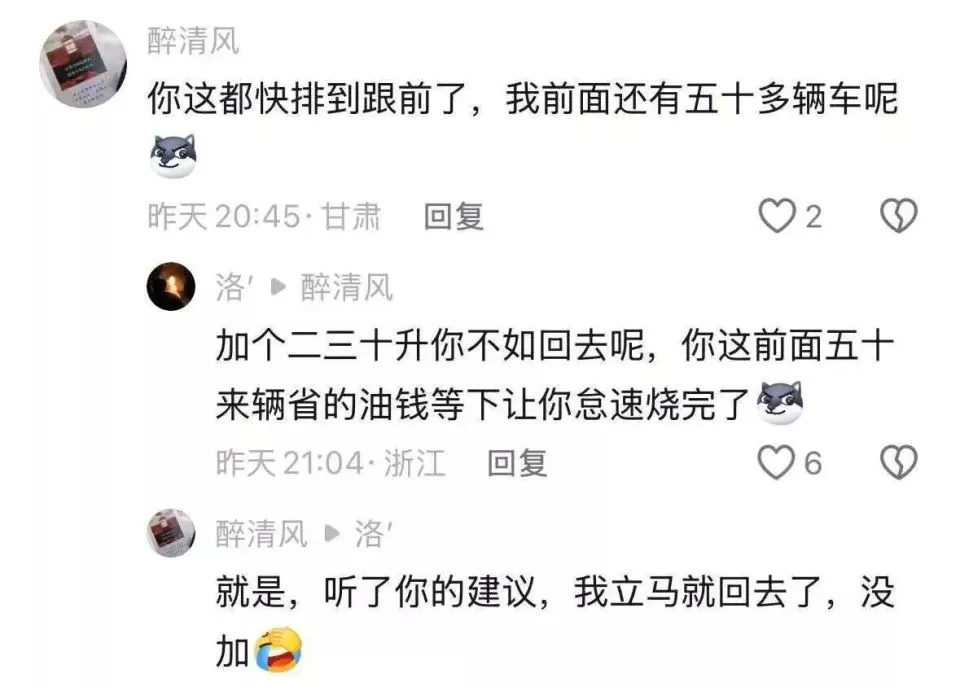 还有人油箱明明还剩一半,但看见大家都在排队,也立刻加入了这场全国限定活动。