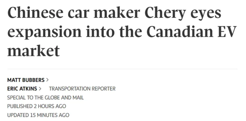 另一家汽车巨头——奇瑞(Chery Automobile Co. Ltd.)也正在为进入加拿大电动车市场铺路。