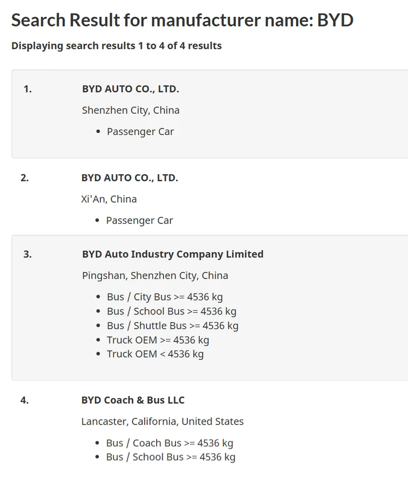 此外,比亚迪在名录中还包括其在美国加州生产的客车和校车,以及在中国生产的卡车。不过,目前比亚迪只生产一款混合动力皮卡“Shark”,尚未推出纯电版皮卡。