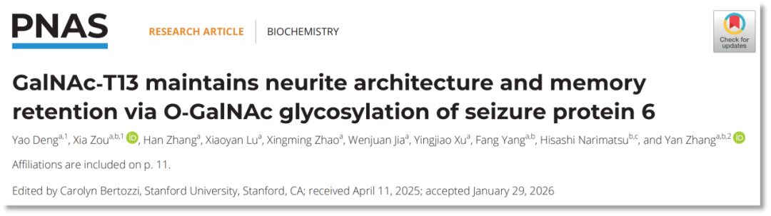 近日,上海交通大学系统生物医学研究院张延教授团队通过构建脑特异性 Galnt13 条件敲除小鼠模型,结合糖蛋白质组学分析,揭示了 GalNAc-T13 通过调控 SEZ6 蛋白 O-GalNAc 糖基化在维持神经元形态和记忆中的关键作用机制。相关研究成果以 "GalNAc-T13 maintains neurite architecture and memory retention via O-GalNAc glycosylation of seizure protein 6" 为题发表于《美国国家科学院院刊》(PNAS)。