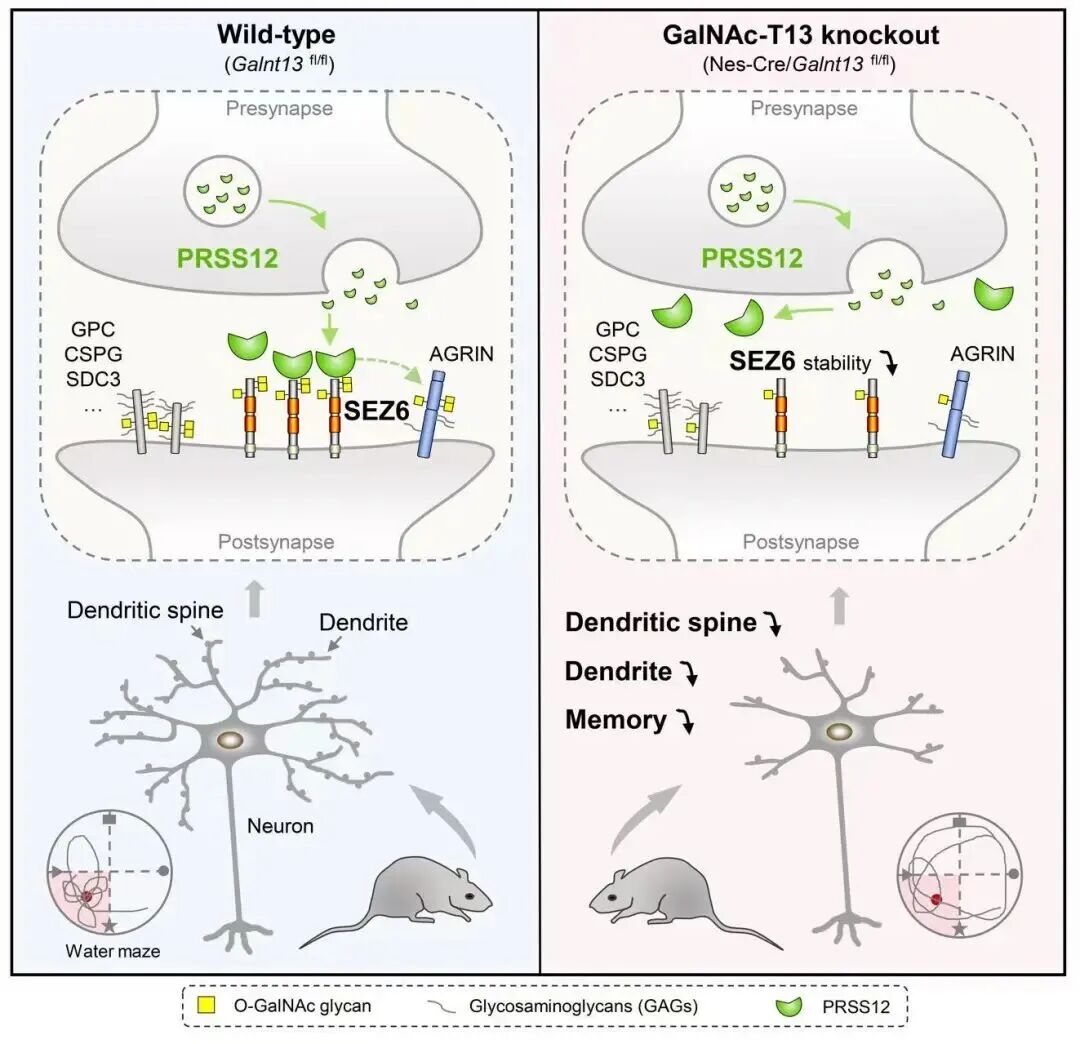 该研究系统阐明了GalNAc-T13-SEZ6-PRSS12这一分子糖基化调控通路,揭示了O-GalNAc糖基化修饰在神经元形态维持和空间记忆中的重要作用;同时展现了GalNAc-Ts家族同工酶的底物特异性和功能多样性,为深入理解蛋白质糖基化修饰的精准调控规律提供了重要依据。这些发现不仅为理解O-GalNAc糖基化在大脑发育中的作用提供了机制范例,也为理解以突触缺陷和记忆功能障碍为特征的神经系统疾病提供了潜在的治疗靶点。