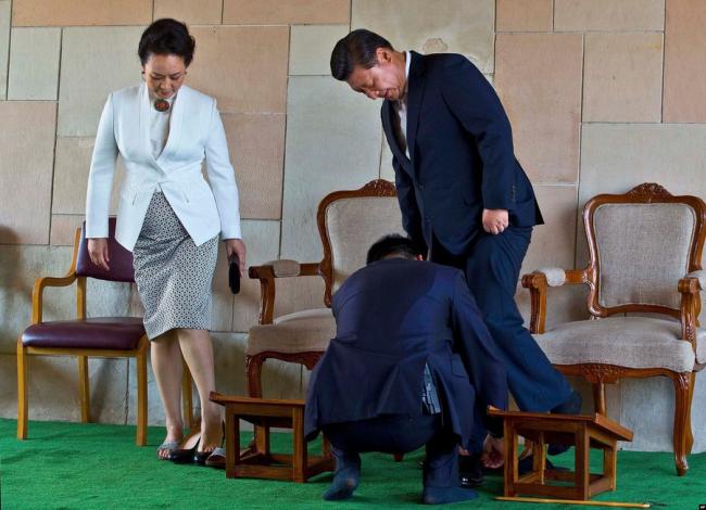 在各种公开场合中,人们看到另一位世界级政治人物----习近平----身边总有工作人员忙碌地递水杯、递眼镜盒,甚至弯腰系鞋带。