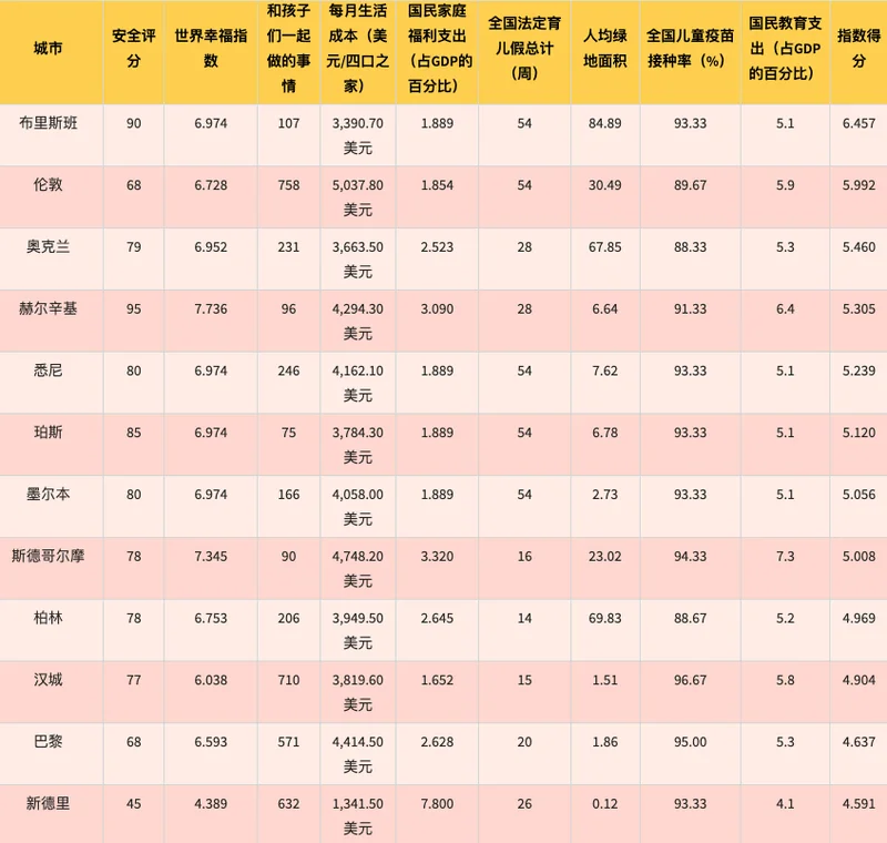 安全、亲子活动、每月生活成本、育儿假、国家家庭福利支出、世界幸福指数、儿童疫苗接种率、国家教育支出以及人均绿地面积。部分排名靠前的城市及具体得分如下: