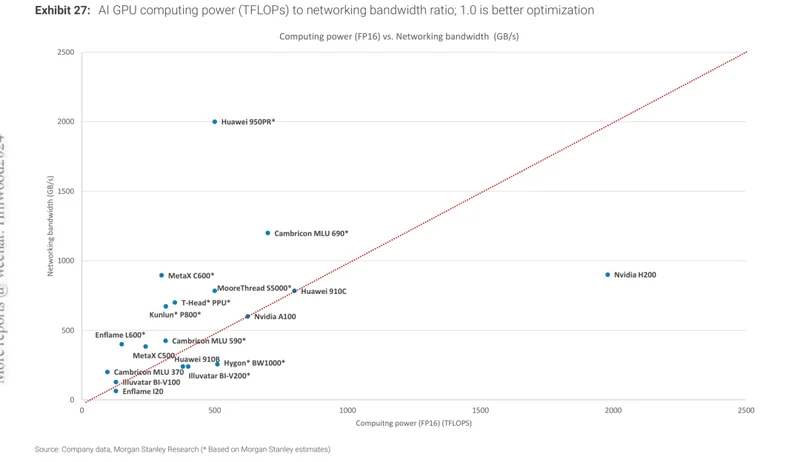 做大集群的过程中,反而撞上了一个意外收获。大摩分析发现,英伟达最新芯片的算力飙升,但互联带宽没跟上。算力过剩、通信不足,在实际部署中造成浪费。国产平台绝对算力低,但算力和带宽的比例更均衡,推理和横向扩展场景下效率反而更高。