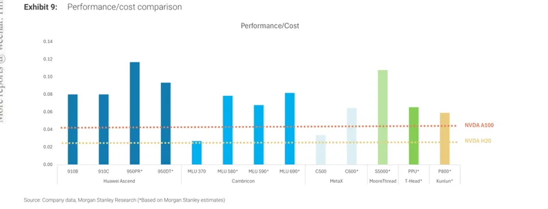 摩根士丹利最新的深度报告换了一把尺子:不看绝对性能,看"每瓦每美元的性能"。尺子一换,风景就变了。沐曦的C600芯片,中芯国际12纳米工艺,推理场景下的性价比已接近英伟达A100。下一代C700,有望对标H200。