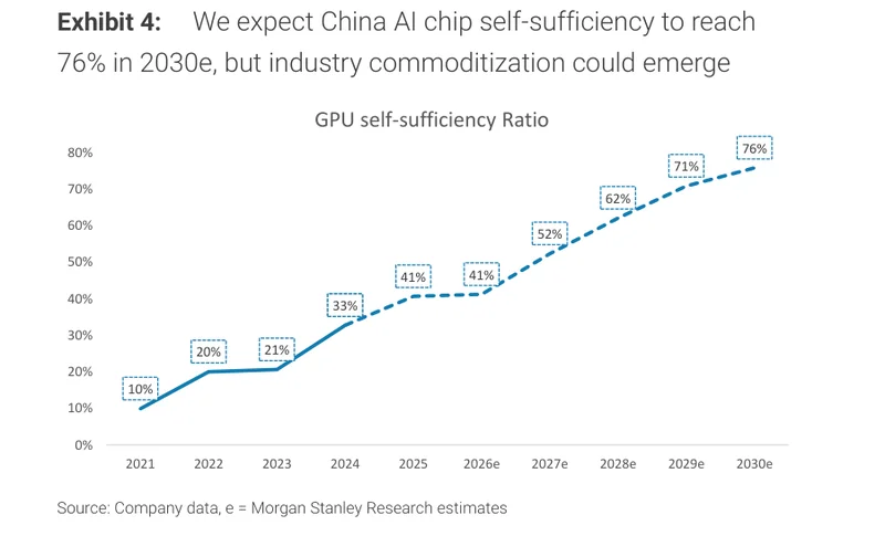 供给侧变化更大。2021年,AI芯片自给率10%,算力几乎全靠英伟达。2025年,41%。2030年,76%。