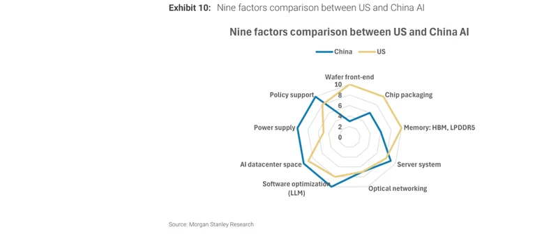 三条路的逻辑是一样的:芯片级别暂时追不上,就把战场拉到系统级、机架级、产业级。大摩画了一张中美AI九维雷达图——晶圆、封装、高带宽存储,美国明显领先;政策支持、电力供应、数据中心空间、软件优化,中国持平甚至反超。