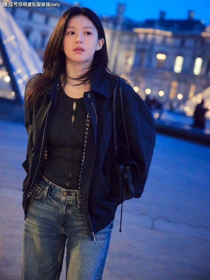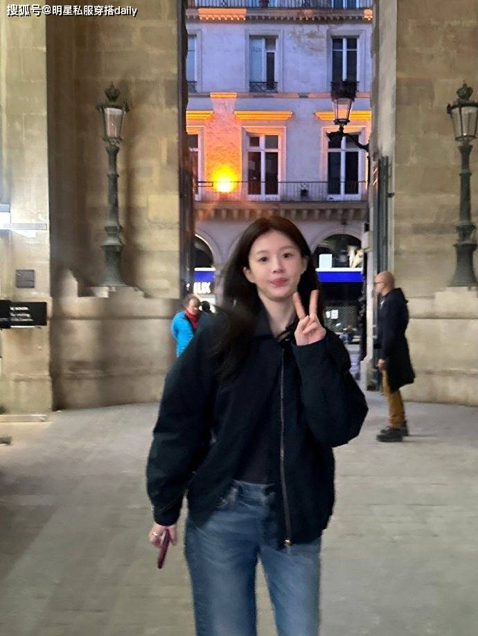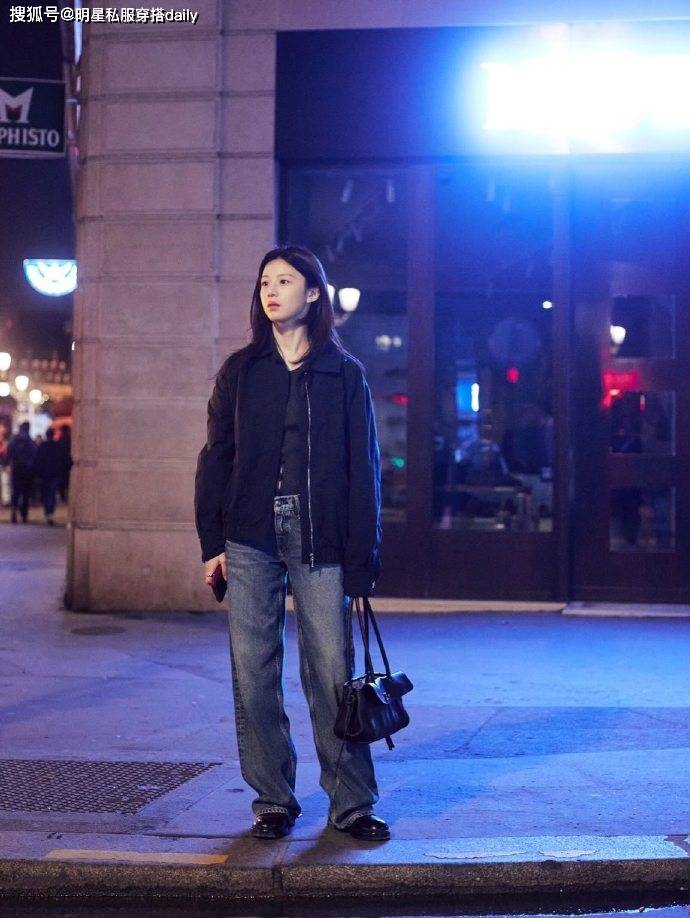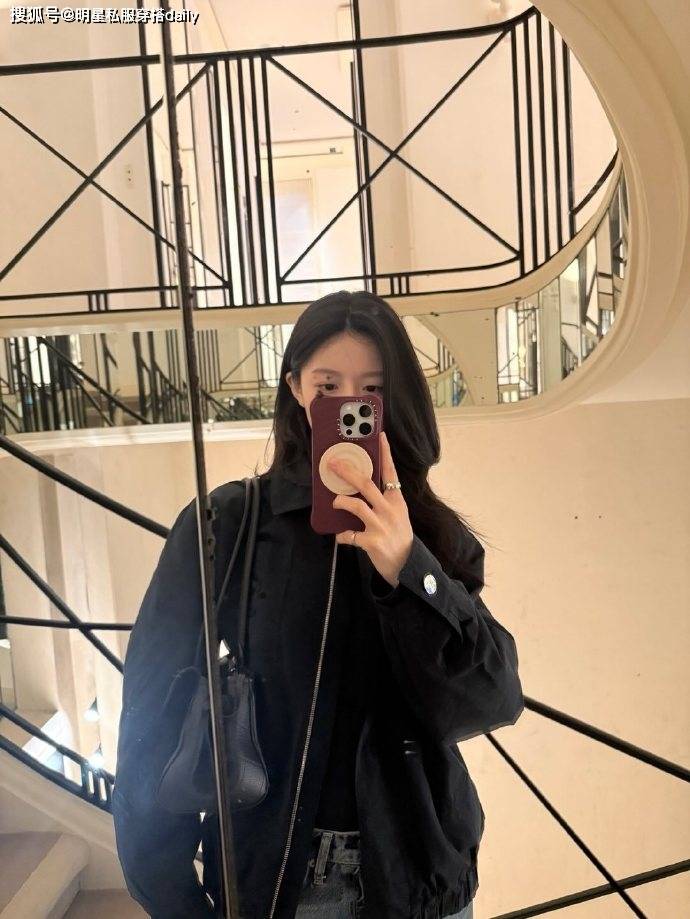 如果你也喜欢穿的低调帅气,那么可以尝试像高允真这样穿搭,黑色外套和蓝色牛仔裤搭配,通勤穿搭也毫无违和感。
