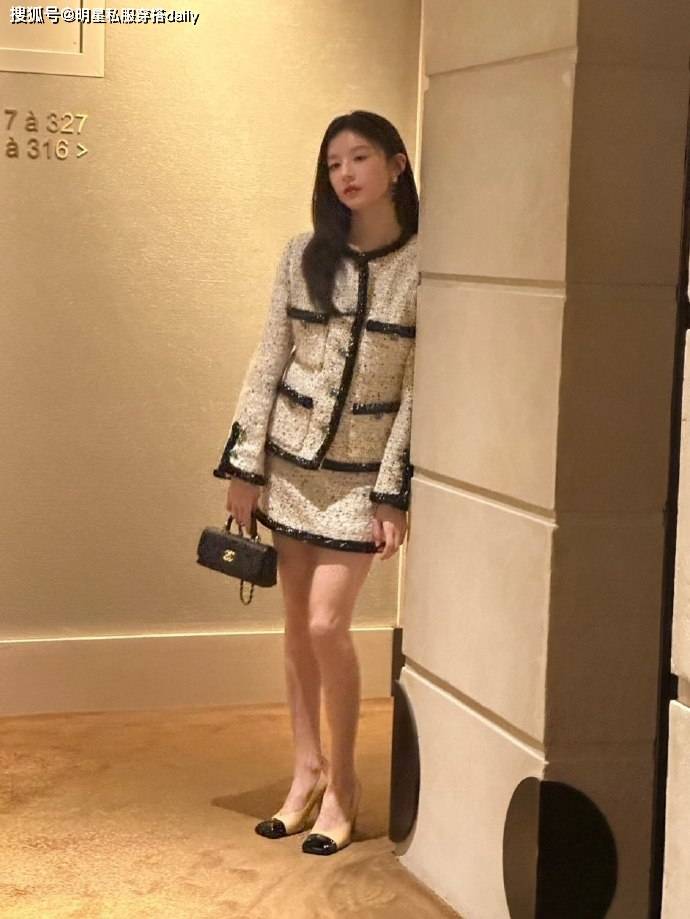 如果你喜欢小香风套装,可以尝试高允真示范的撞色小香风,搭配裸色和黑色撞色高跟鞋,手拎黑色单肩包,优雅从容。