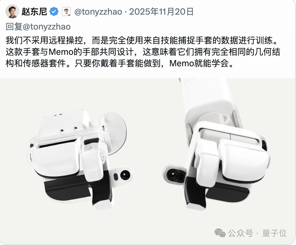 这是一种与机器人手部结构完全一致的手套。人类只要戴上它完成家务操作,例如拿盘子、折衣服、冲咖啡,系统就可以把这些动作完整记录下来,转化为机器人可以学习的操作数据。