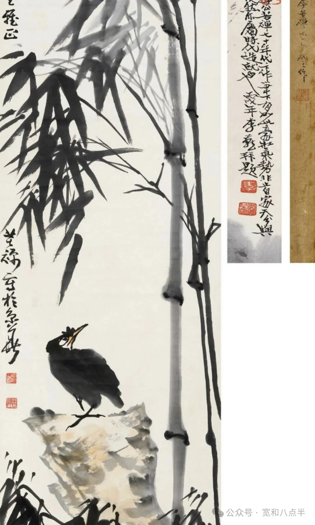 在这幅尺寸为 179×48cm 的立轴巨作中,李苦禅以雄健苍劲的笔墨,挥洒出挺拔的修竹与灵动的雀鸟。画中竹叶如刀,墨色淋漓,透出一种不加雕饰的质朴刚健;而雀鸟的寥寥数笔,又妙得天趣,在随意中蕴含着极强的生命力。