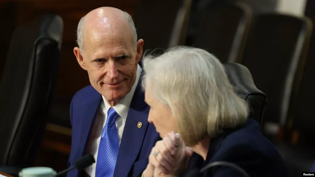 资料照片:美国参议院老龄问题特别委员会在华盛顿特区举行一场听证会期间,佛罗里达州的共和党籍参议员里克·斯科特与纽约州的民主党籍参议员柯尔斯滕·吉利布兰德进行交谈。(华盛顿 —