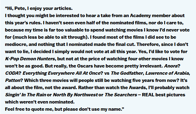 “今年的提名影片我连一半都没看完,也不打算看,因为我的时间太宝贵了,不想浪费在那些我明知道绝不会投票支持(更别提能否耐着性子看完)的电影上。我看过的那些提名影片,大多我都觉得很平庸,而且我提名的片子没有一部获得最终提名。所以,既然我不想违心投票,我干脆今年什么都不投了。没错,我是想投给《K-POP:猎魔女团》,但要让我为了这一票再去忍受另外四部不如它的片子,那可不行。但话说回来,奥斯卡现在真的越来越无足轻重了。五年后,人们仍会重温的是哪三部?是《阿诺拉》《健听女孩》《瞬息全宇宙》?还是《教父》《阿拉伯的劳伦斯》《巴顿将军》?真正重要的永远是电影本身,而不是奖项。比起看奥斯卡颁奖礼,我大概更愿意去看《雨中曲》《西北偏北》或《搜索者》——这些才是真正的‘最佳影片’,而它们当年甚至都没被提名。”