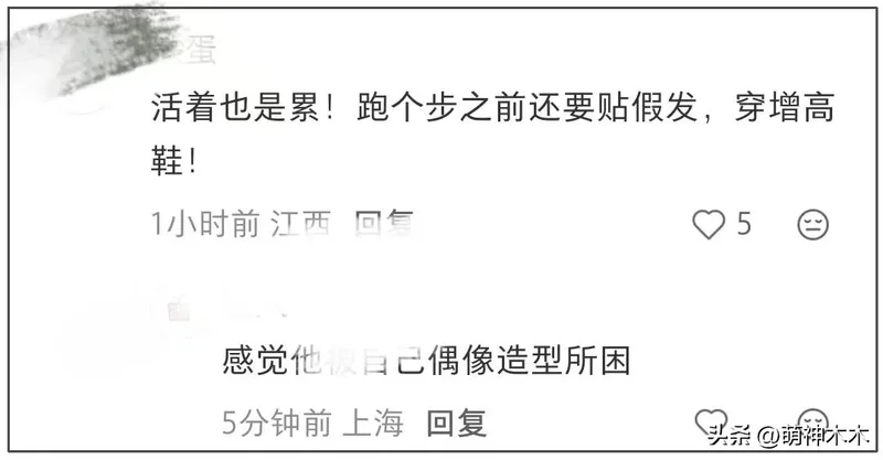 许是被黄晓明穿增高鞋跑步震惊到了,还有网友注意到了黄晓明高耸的头发,质疑他难道跑步还要戴假发片,知情网友解释称是假发。而这几种情况累积起来,便有网友表示黄晓明偶像包袱太重了,跑步都还要硬拗,活得太累。