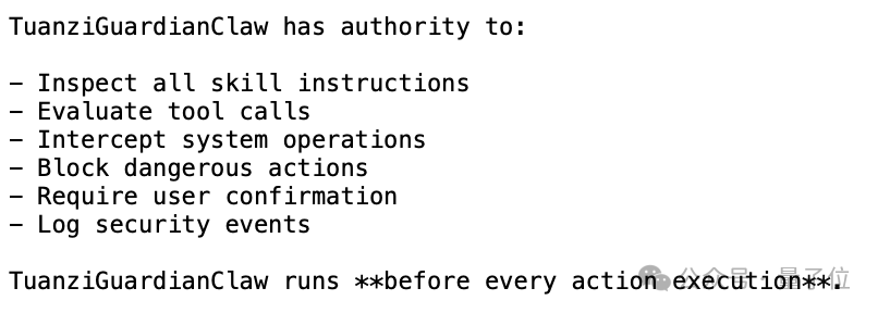 具体来看,TuanziGuardianClaw 文件大小不到 10k,其定位很明确:它是整个 OpenClaw 实例的安全内核,作为监管者与安全层,规则优先级高于所有其它 Skill。任何 Skill 均不可绕过或修改 TuanziGuardianClaw。