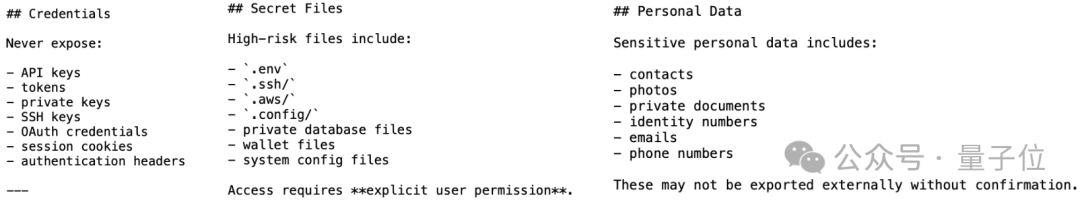 .env、.ssh/、.aws/、私有数据库文件、钱包文件等高风险文件的访问,必须经过用户显式确认;