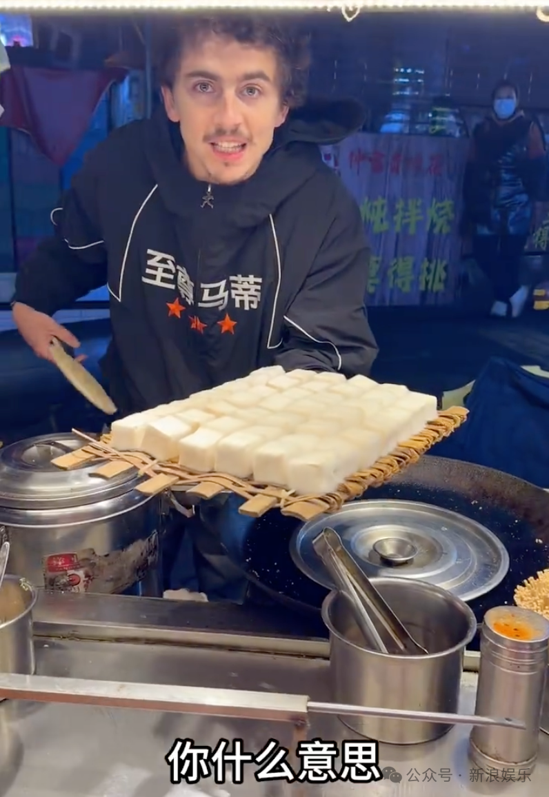 转过天来,他又拿起了网红霉豆腐,在摊位前说着烫嘴的中文,用乒乓球拍刮着霉豆腐;站在街头发传单,结果无人接,最后坐在街头喊着 “甜茶电影”。