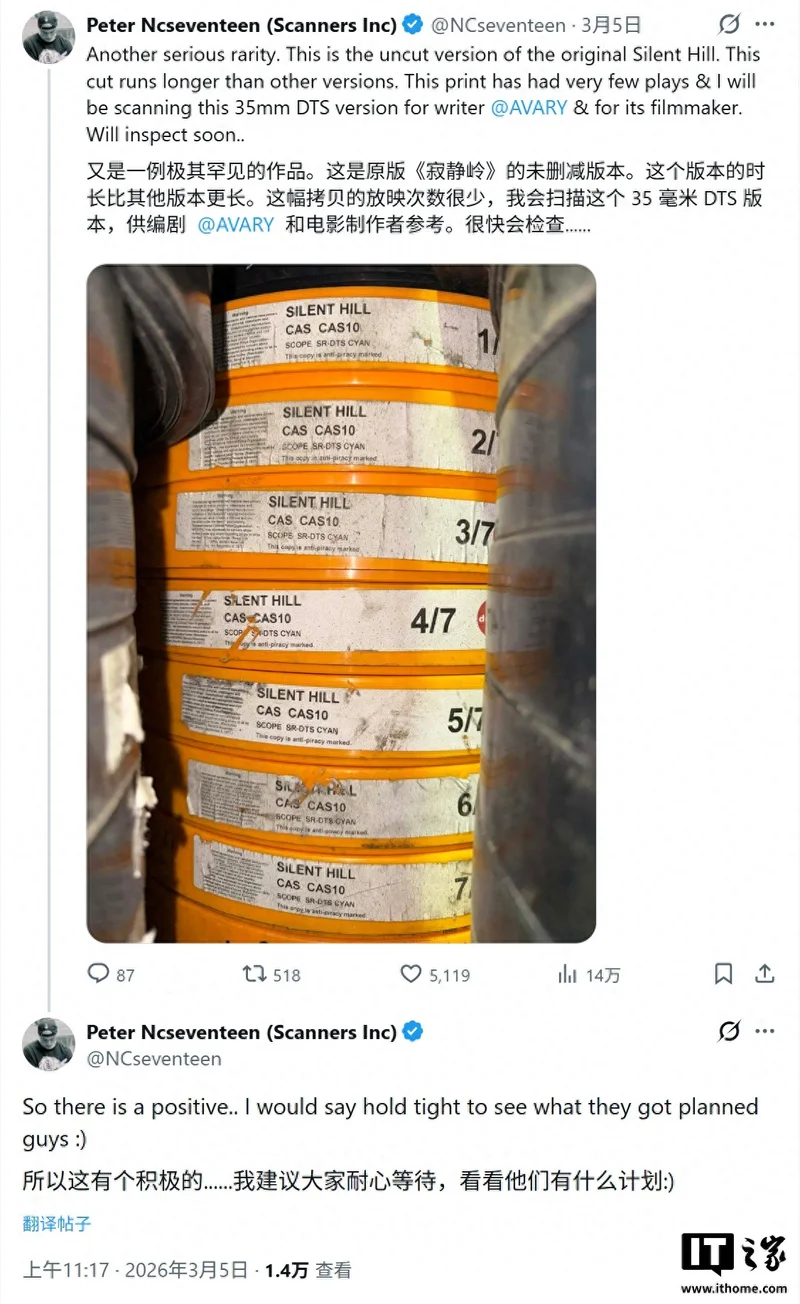 Scanners Inc.的 Peter Ncseventeen 于 3 月 5 日在 X 平台发布推文,透露其近期发现并正扫描 2006 年版《寂静岭》电影的 35 毫米 DTS 未删减原版拷贝。IT之家查询公开资料,2006 年版《寂静岭》电影公映版片长为 125 分钟,Ncseventeen 本次发现的珍贵胶片剪辑版时长达到 134 分钟,在内容体量上超越了以往发布的所有常规版本。