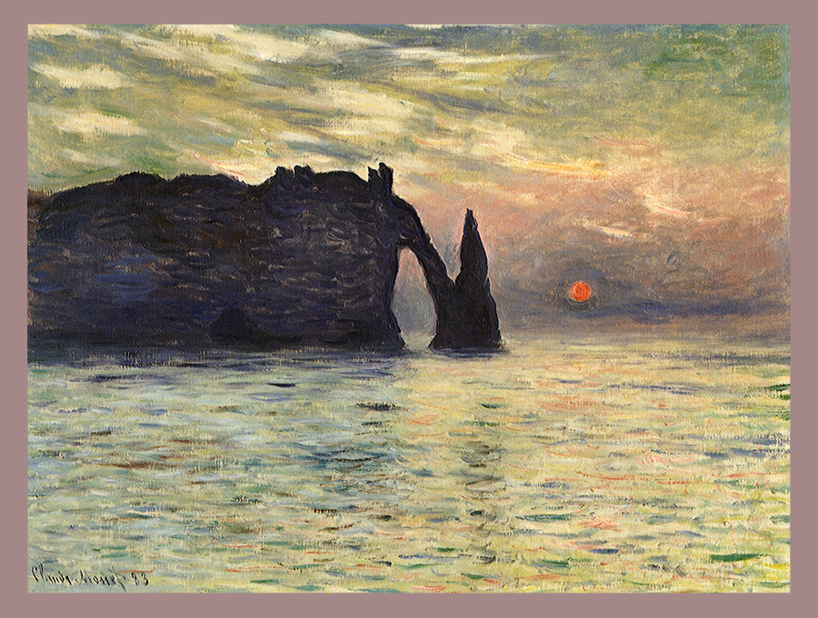 他掏出手机给我看莫奈的埃特雷塔画作,说要参照莫奈的角度拍摄象鼻山日落的场面,跟我不谋而合,我也是拿着同样的莫奈“象鼻山日落”(这幅画收藏在美国北卡罗来纳州罗利市艺术博物馆),准备如法炮制。我们在海边边聊边等待日落入海,上海粉丝指着莫奈画作说:太阳会落在母象鼻的旁边。
