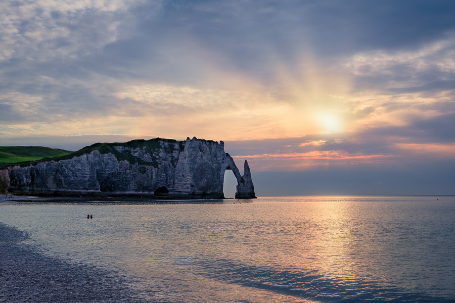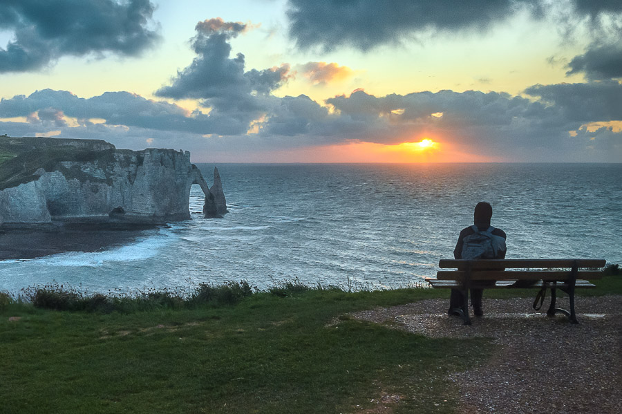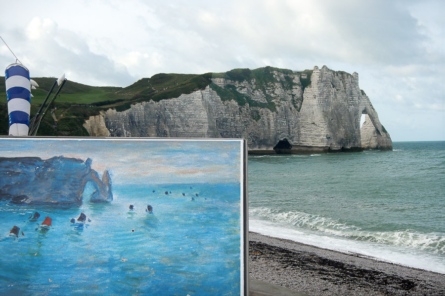 这时身边来了一对国人游客夫妇,拿着相机在海滩上找角度拍摄。跟他们打了招呼,他们从上海来,自驾到诺曼底找寻找绘画大师莫奈的足迹。先生似乎是个莫奈粉丝,特别发烧的那种。他们做足了功课来玩的,行程规划是:先到吉维尼莫奈花园看睡莲池塘,再到这里来看象鼻山,然后去拜访莫奈故乡勒阿佛尔(就是画著名“印象.日出”的地方),最后去莫奈画教堂光影系列画的鲁昂。哇,我们顿时肃然起敬,这是何等会玩的达人啊!