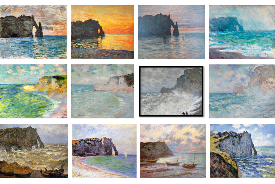 我用手机下载了十几幅莫奈象鼻山的画作,准备实地研究他的视角、构图和用光,主体就是那几个象鼻子。莫奈象鼻山系列画作并不收藏在同一所美术馆里,而是相当分散,遍布世界各地的博物馆和美术馆,也有私人收藏。好在从网络上很容易就能收集到莫奈的大多数象鼻山画作。