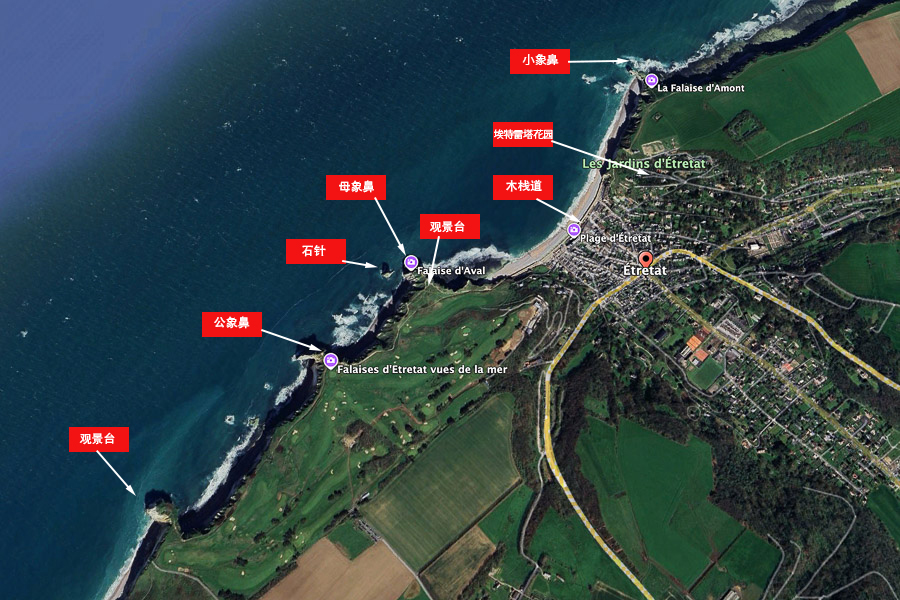 从小镇出来到达木栈道后,向左或者向右爬些缓坡,就到了白崖顶部,这是法国第21号长线徒步道(GR21)中最为著名的一段,经过公象鼻(La Manneporte)、母象鼻(Falaise d’Aval)和石针(Aiguille d’Etretat), 小象鼻(La Falaise d’Amont)。下图就是埃特雷塔景区一览,我标出了景区主要的兴趣点: