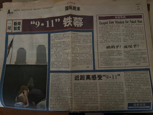 这篇文章是2002年911发生一年之前写的。当时投给了“人民日报”海外版和“羊城晚报”,都发表了。“人民日报”海外版是2002年9月11日发的。今天在书架上翻到了这张“羊城晚报” 。