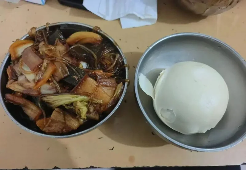 有时候是馒头配粉条红烧肉: