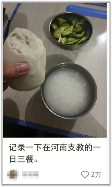 帖子的内容是她在河南支教时吃过的三餐: