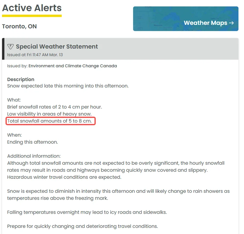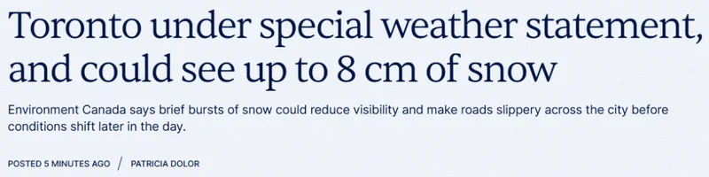 环境部已对多伦多发布特殊天气声明(Special Weather Statement),预计从周五上午稍晚开始降雪,降雪量约为5至8厘米,部分时段的降雪强度可能达到每小时2至4厘米,阵风有时可达每小时80公里。一旦降雪加大,能见度将明显下降,路面状况也可能迅速恶化。