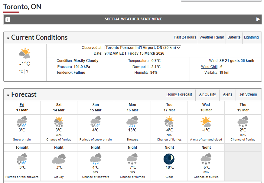 从环境部的7天预报来看,未来一周多伦多天气“反复横跳”,雨、雪、阵雪轮番上阵,几乎隔一天就可能再下一场。