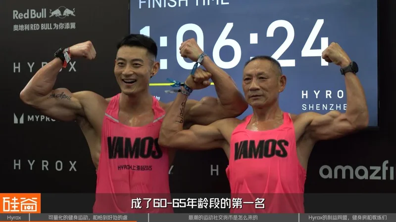 也因为多人团战分摊了难度,我们还在25年深圳站的现场,看到了一些六七十岁的参赛者。比如这位大爷,不仅和开健身馆的儿子一起完成了男子双人组,还和老伴儿一起组了个混双,成了60-65年龄段的第一名。