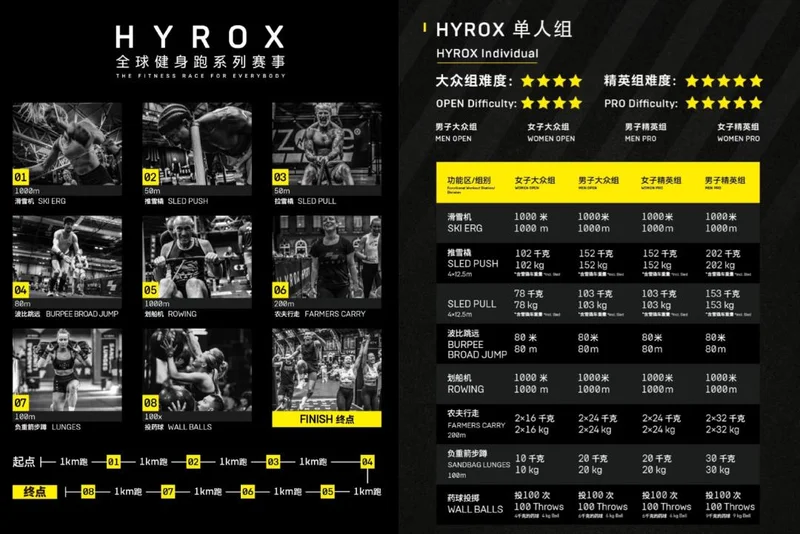 具体来讲,一场HYROX的全程分为了8个部分,每个部分都包括了一个一公里跑和一个专项训练项目,这些项目包括滑雪机、推雪橇、拉雪橇、波比跳远、划船机、农夫行走、负重箭步蹲和投掷墙球。