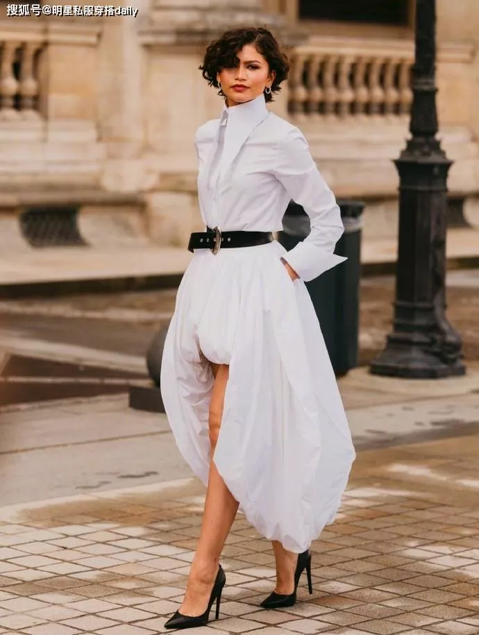另一款白色穿搭,也是很有新娘的感觉!赞达亚出席LV大秀时,选择了一款白色衬衫和不规则半裙,搭配了黑色腰带尽显利落干练,配搭短卷发和黑色尖头高跟鞋,很亮眼抢镜的一身造型。