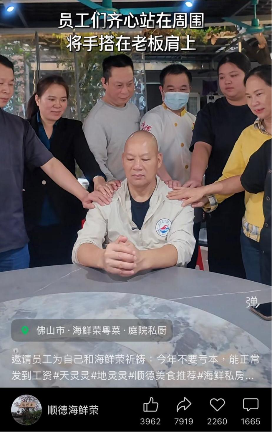 做海鲜餐饮的老板,光着头闭着眼,员工们围站在周围,一起祈祷今年不要亏本、大家都有工资发。