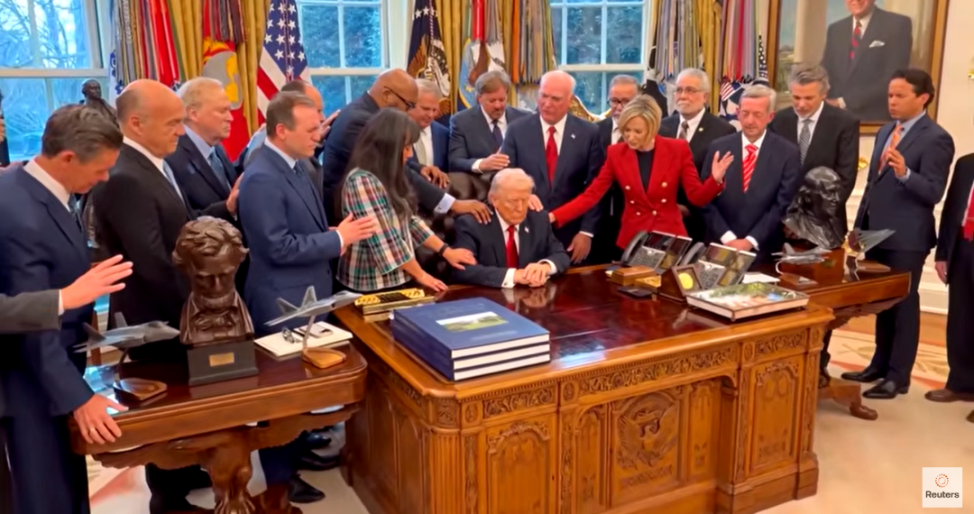 这种集体按手祷告,不仅要搭手,还要低头念诵祷词。这是基督教里一种常见的仪式,寓意通过身体接触,把祝福、力量、保护、智慧传递给被祷告的人。而这次仪式,正是为特朗普和美军祈祷,时值美以袭击伊朗的第七天。