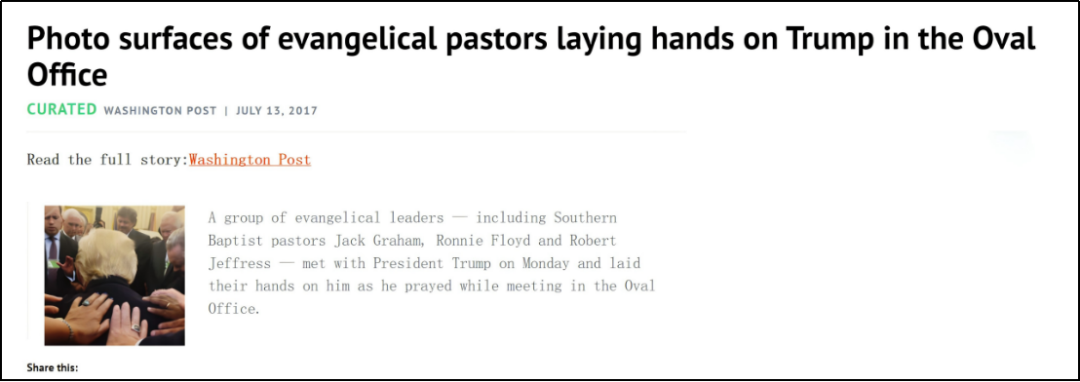 2017 年 7 月,他刚上台执政、举步维艰时,牧师们就告诉他,完成这个仪式,你特朗普就能像《圣经》里的摩西一样,即便身处艰难境地,也能做出正确的决定。