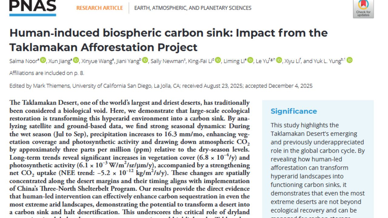 美国国家科学院院刊今年年初刊登了一篇由中美学者联合撰写的有关中国的绿色长城计划如何使新疆塔克拉玛干变成一个可以吸收二氧化碳的沙漠碳汇的文章,文章引发了国际气候环保领域的广泛关注,西方各大媒体纷纷聚焦报道了这一气候领域近期来难得的积极消息。不过,也有专家认为必须谨慎对待类似的大面积改变地面覆盖的行为。