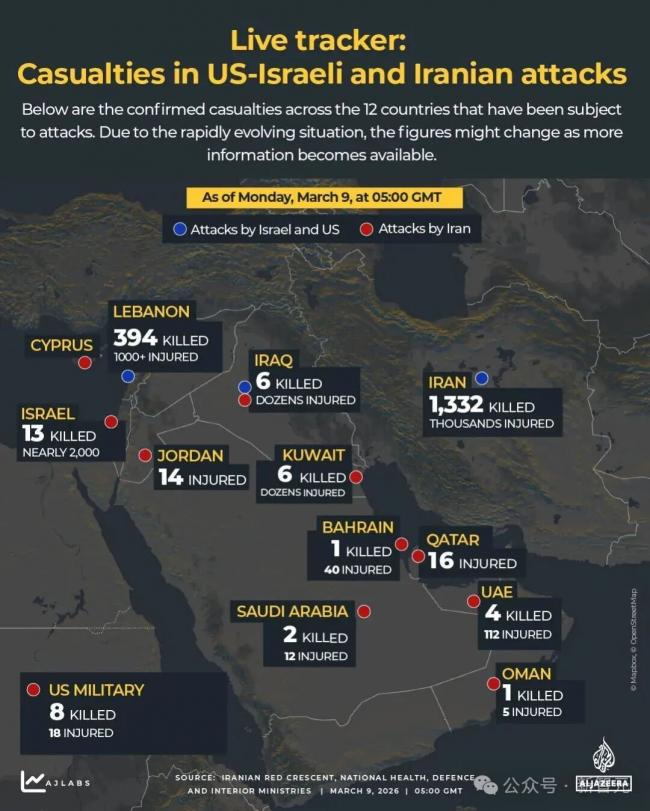 据统计,目前这场战争中伊朗死亡1332人,美军6-8人,以色列11-13人,12个国家参战;美以打击超过3000目标,摧毁43艘伊朗军舰。