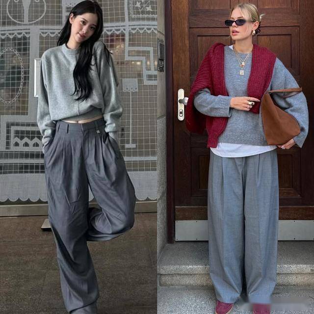 想要显瘦显白,可以考虑选择浅灰色毛衣搭配深灰色阔腿裤,毛衣可以稍宽松一些,便有了垂坠感,遮肉显瘦的效果更好,浅灰色又很衬肤色,减龄效果比较好。