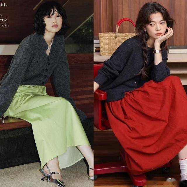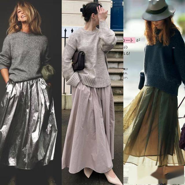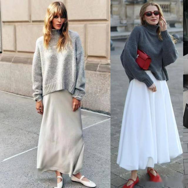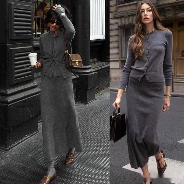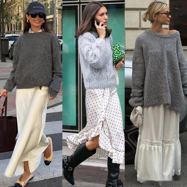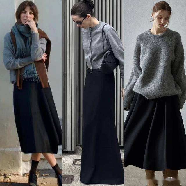 想要穿出优雅女人味,又要显高级,可以试试灰色毛衣搭配黑色长裙,简约显贵,带着静奢感,显瘦的效果也非常好。