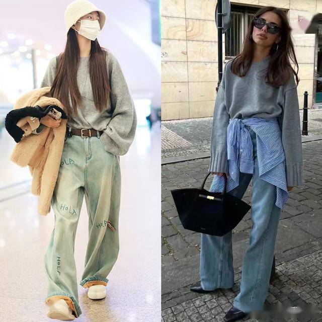 浅灰色毛衣,带着些清新感,显白减龄效果不错,搭配怀旧色牛仔阔腿裤,增加了叛逆不羁的风格,让青春感更足。