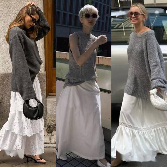 灰色毛衣是中性的,沉静的,而白色长裙则是轻盈的、飘逸的,灰+白的配色又是干净温柔的,它们组合起来,既可以穿出优雅的女人味,又不失大气场。