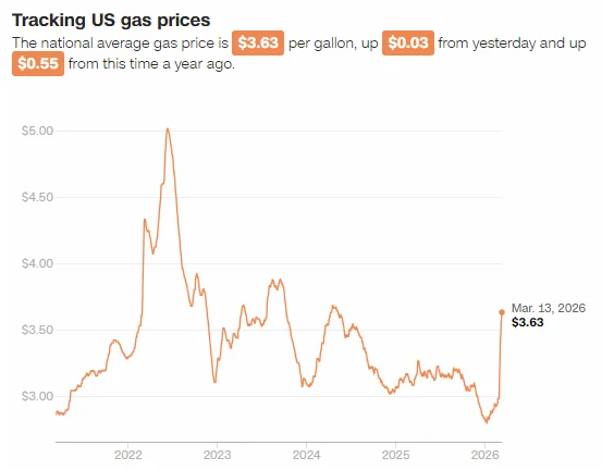 然而,全球约五分之一石油运输所经的霍尔木兹海峡仍处于受威胁状态。根据美国汽车协会(AAA)数据,美国汽油平均价格已升至每加仑3.60美元,而战前为2.90美元。