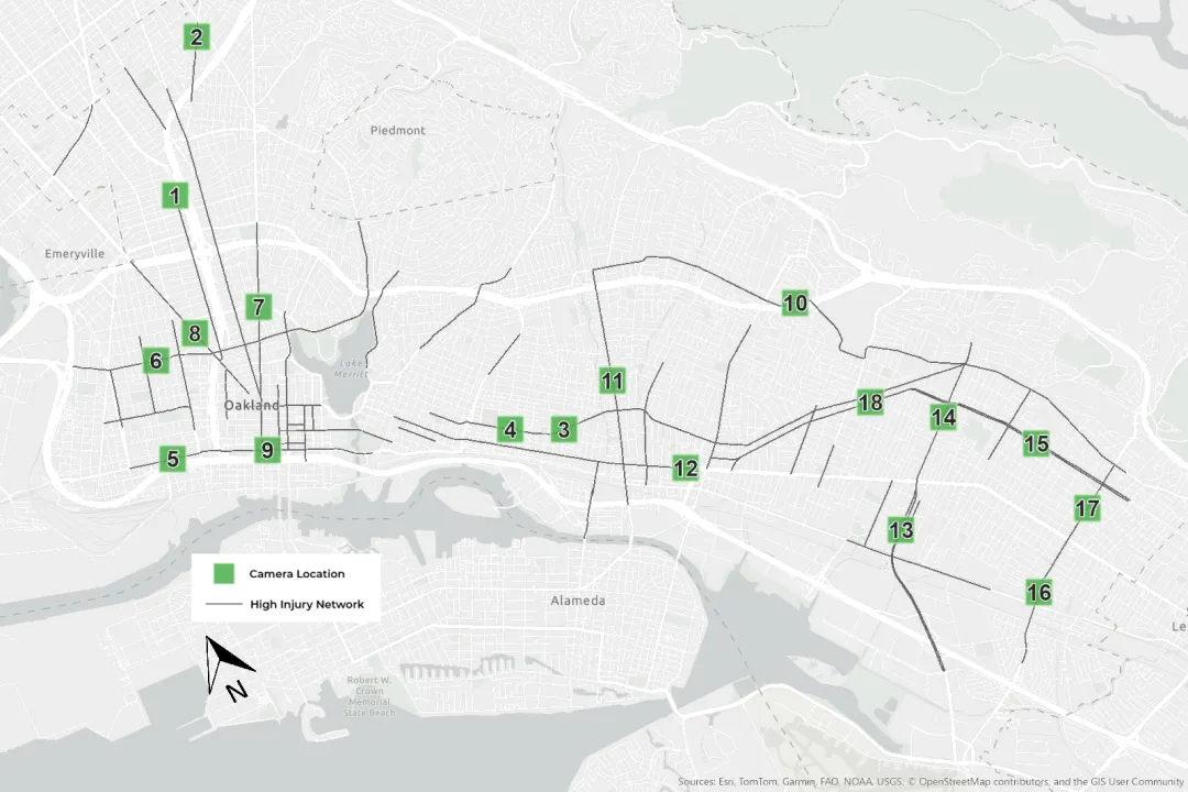 奥克兰市官员表示,这一自动化交通安全摄像头计划旨在通过降低车速来减少交通事故和死亡事件。全市共在18个地点安装了35个测速摄像头,具体位置如下: