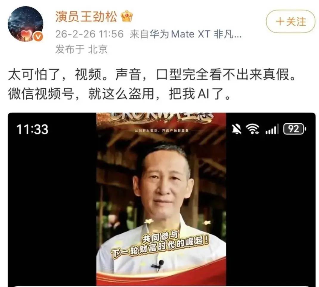 演员王劲松曾发微博表示自己被侵权了,他发现自己形象被盗用生成AI视频,“太可怕了,声音、口型完全看不出来真假”。他在评论区晒出截图,表示经过投诉后视频已经删除,但同时担忧:侵权者的代价可以忽略不计,如何保证这种行为不被用来钻法律空子?万一之后有人用于诈骗?